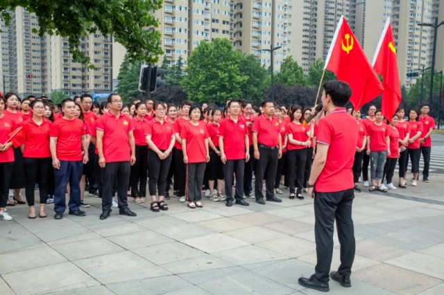 蔚藍的天空下,闊大的中心湖平臺上,一面鮮艷的黨旗高高聳立。兩名旗手高舉黨旗和國旗,沿著炎黃科技園黨建長廊向平臺飛奔而來。